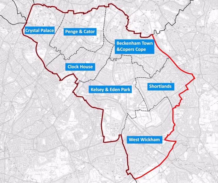 * While most of the Shortlands & Park Langley ward is included in the Beckenham and Penge constituency, the section of the ward east of the railway line (which includes Shortlands Village, Queensmead, and Ravensbourne) is part of the Bromley and Biggin Hill constituency.
